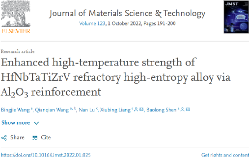 综上所述,这项工作揭示了在HfNbTaTiZrV RHEA中适当添加Al2O3氧化物在室温和高温下增强了合金。体积分数为4%的Al2O3合金在室温下的强度为2700 MPa,在800°C下的强度为1392 MPa,在1000°C下的强度为693 MPa。Al2O3的加入同时引起间隙强化、晶界强化和弥散强化。一方面,氧原子的间隙溶解增加了晶格畸变,表现出良好的间隙强化效应。另一方面,Al2O3颗粒不仅钉扎在晶界,抑制晶粒生长和细化晶粒,而且阻碍位错的运动。动态再结晶是高温下强度降低的主要原因。通过调整织构体积分数,可以进一步优化合金的织构。这项工作揭示了通过真空电弧熔炼添加氧化物颗粒以改善高温下RHEAs的力学性能和相稳定性的可行性,从而拓宽了轻质耐火高熵合金的应用范围。
