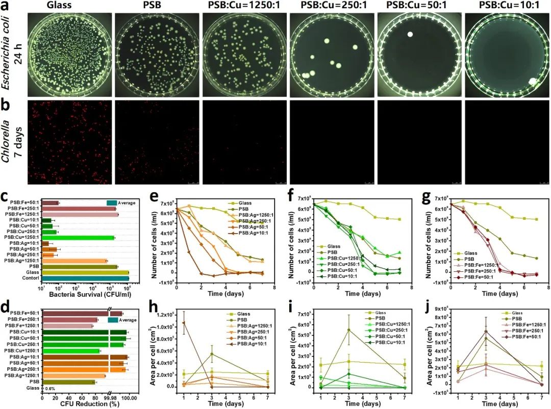 由降解产生的四重防污机制作用赋予了材料高效的防污能力。相比于对照组,该材料表面难以观察到粘附的细菌和海藻的存在,对于细菌和海藻的抑制率均可达99%以上,而且通过添加少量具有抗菌防污能力的Cu2+、Ag+等金属离子(添加量小于3%,远小于传统防污材料中防污剂的添加量),可协同增强材料的防污能力,抗菌率和抗藻率可达99.9%以上,如图2。