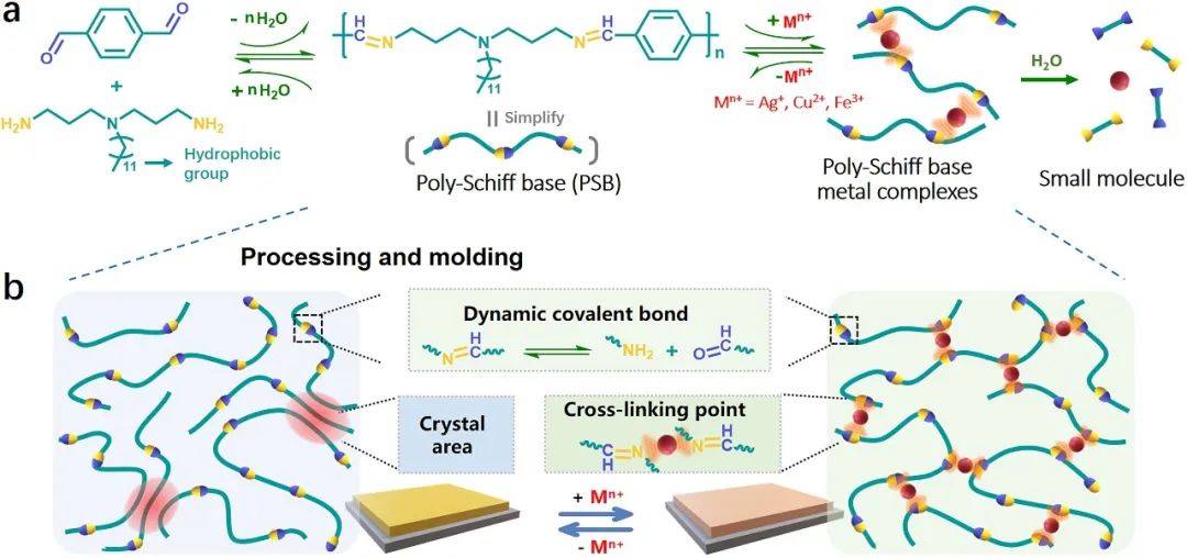 研究人员基于亚胺键的可逆共价键和金属离子配体特征,由对苯二甲醛与疏水性二元伯胺脱水缩合制备了在主链结构中具有亚胺键的聚席夫碱高分子。进一步地,利用亚胺键与金属离子的配位能力,将聚席夫碱中的亚胺官能团与金属离子发生配位反应生成高分子金属络合物,形成动态化学交联点,在赋予材料自修复能力的同时,解决了聚席夫碱材料机械性能较差和分子量较低的问题,如图1。聚席夫碱中亚胺键的动态共价键特征使其在海水环境下可降解为具有防污能力的小分子醛类物质和氨类物质,可在自然界中快速降解不产生累积效应,环境友好的同时,提高降解产物的防污利用率。