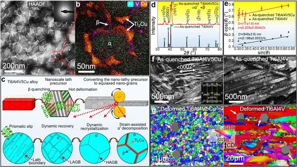 图2 双相蜂窝壳结构纳米晶Ti6Al4V5Cu合金的组织表征与形成机制分析,(a)HAADF成像模式观察;(b)能谱面扫描观察;(c)双相蜂窝壳结构形成机制示意图;(d)XRD衍射图谱;(e)β·cos(θ)-sin(θ)图,添加Cu使淬火后合金内的微观应变增大;(f)添加Cu细化了马氏体板条;(g)添加Cu有利于合金在热变形过程中发生柱面滑移而形成等轴晶结构。