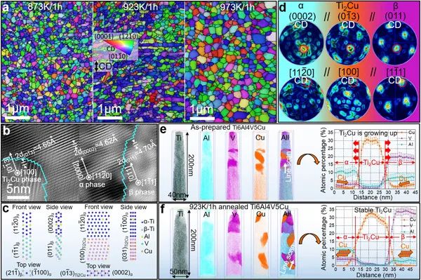 图3 双相蜂窝壳结构纳米晶Ti6Al4V5Cu合金的组织热稳定性分析,(a)在不同温度保温1 小时后的EBSD组织;(b)高分辨TEM观察,表明α、β、Ti2Cu相之间具有特定的晶体学取向关系;(c)基于第一性原理计算材料相界能的模型;(d)EBSD极图,表明α、β、Ti2Cu相在700℃保温1小时后仍然可以保持初始的取向关系;(e)Ti6Al4V5Cu合金初始态组织的3DAP分析;(f)Ti6Al4V5Cu合金在650℃保温1 小时后的3DAP分析。