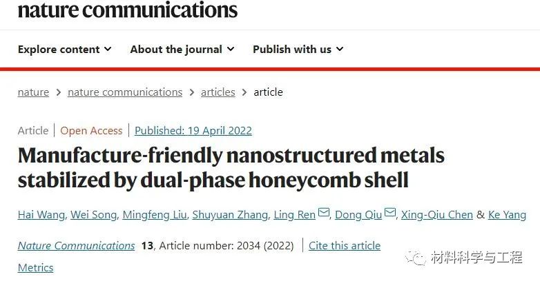 金属研究所杨柯团队长期从事新型医用金属材料的基础与应用研究。近期,团队成员任玲、王海等通过“双相壳层包裹超细等轴晶”的显微组织设计思想(图1),同时从热力学、动力学两方面提高超细晶钛合金组织热稳定性,并利用常规热处理与热加工的工艺组合,实现了上述显微组织的大尺寸制备,解决了超细晶钛合金制备加工难、组织稳定性差的两大瓶颈问题,获得了性能优异和热稳定性高的超细晶含铜钛合金。4月19日,相关研究成果以 “Manufacture-friendly nanostructured metals stabilized by dual-phase honeycomb shell” 为题在《自然-通讯》(Nature Communications)在线发表。