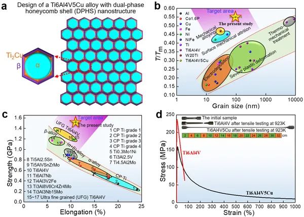 图1 双相蜂窝壳结构纳米晶Ti6Al4V5Cu合金的组织设计与性能,(a)组织设计示意图;(b)失稳温度-晶粒尺寸图,显示材料具有良好的组织热稳定性;(c)室温强度-延伸率图,相较于其它钛合金,材料具有良好的强塑性匹配;(d)650℃/0.01s-1条件下的拉伸应力-应变曲线,材料的延伸率超过1000%。