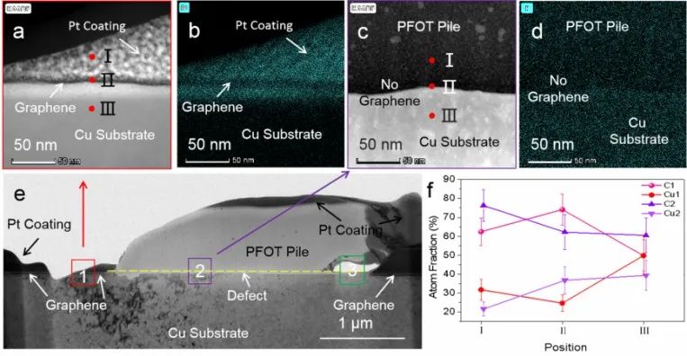 此外,硫醇与基底铜原子和缺陷边缘碳原子之间的化学键导致PFOT分子扩散到缺陷位置的Ehrlich-Schwoebel势垒降低。这就使得PFOT分子可以很快(仅在15分钟内)且精准的修复石墨烯缺陷。研究人员进一步使用FIB制样并采用TEM观察修复后缺陷位置石墨烯与PFOT分子的微观结构,发现PFOT分子只在石墨烯缺陷处的铜基底上生长,与无缺陷完整石墨烯具有明显且精确的分界,这充分验证了上述PFOT修复石墨烯缺陷机制和化学键合机制(图3)。