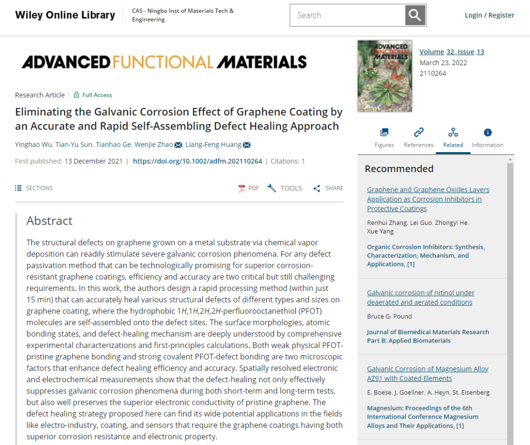 近期,中国科学院宁波材料技术与工程研究所海洋实验室苛刻环境材料耦合损伤与延寿团队设计了一种快速、精准修复石墨烯缺陷的方法,可以在15分钟内高效地修复石墨烯上多尺度和多类型缺陷,在提高石墨烯膜层腐蚀防护性能的同时不影响石墨烯优异的导电性能。