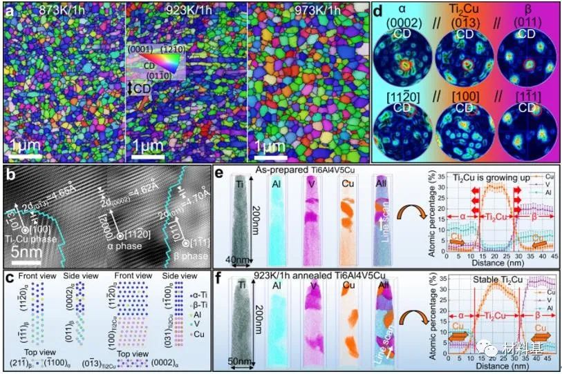 图3 (a)Ti6Al4V5Cu样品在不同温度下退火的IPF图,为简洁起见,仅显示了α相的IPF图,图中表示压缩方向(CD)。(b)HRTEM显示α/Ti2 Cu/β相的低错配取向关系。(c)为第一原理计算的界面结构模型。(d)Ti6Al4V5Cu样品在973K退火后的极图,保留了初始的低能取向关系。(e)对Ti6Al4V5Cu样品APT分析,铜浓度梯度表明Ti2 Cu/β壳可以快速形成。(f) 923K/1h退火Ti6Al4V5Cu样品的APT分析。(e)和(f)中的误差线表示测量的Al、V、Cu含量的标准偏差。