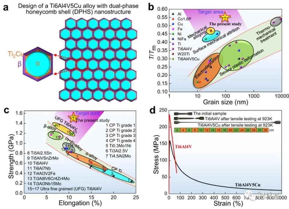 图1 (a)双相蜂窝壳(DPHS)纳米结构;(b)不稳定温度与平均晶粒尺寸。用电沉积严重塑性变形热机械处理表面机械磨损和机械合金化处理的金属的文献数据。误差棒表示测量晶粒尺寸的标准偏差。(c)拉伸强度与伸长率;(d)923K时的应力与应变曲线,展示了Ti6Al4V5Cu合金的超塑性