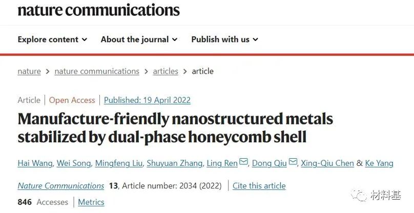 中科院金属所基于Ti6Al4V5Cu合金,开发了一种双相蜂窝壳(DPHS)纳米结构。等轴纳米颗粒类似于蜂窝中的隔室,完全封装在薄的双相壳中。热稳定性差的大角度晶界被低能相界所取代,以热力学稳定纳米结构。此外,双相壳中生长相受到另一相的约束,因此壳本身具有较高的稳定性。当纳米结构暴露于高温或塑性变形时,稳定的壳结构可以在纳米颗粒上施加有效的钉扎力以在动力学上稳定纳米结构。此项研究发表在Nature Communications上,题目为“Manufacture-friendly nanostructured metals stabilized by dual-phasehoneycomb shell”。链接: