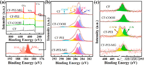 图 4.(a) 不同CF的宽扫描XPS光谱和(b)C1s和(c)N1s峰值的相应高分辨率XPS光谱