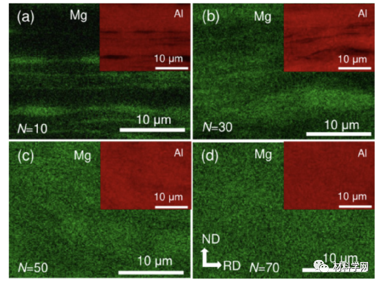 图3所示为不同Al-Mg中间样品的显微组织:(a)-(d) ARB后Al-17Mg中间样品的Mg元素分布((a) 10; (b) 30; (c) 50; (d) 70)的SEM-EDS表征;插图是相应的Al元素分布。