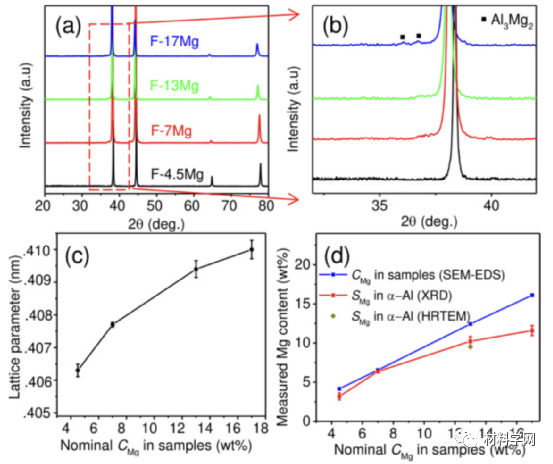 图 8所示为(a) 不同 CMg 制备的 Al-Mg 最终样品的 XRD 图谱;(b) (a) 中放大的 XRD 图案;(c) 不同CMg的Al-Mg最终样品的晶格参数计算;(d) 使用不同方法测量不同CMg样品中的 Mg 含量。