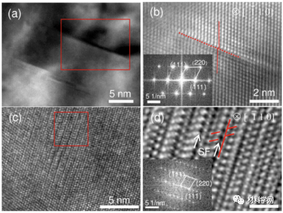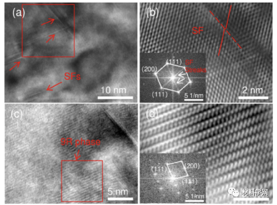 图10所示为所制备的 Al-13Mg 合金的显微组织:(a) SF 的 HRTEM 图像;(b) (a) 中红色框的放大 HRTEM 图像,插图是相应的 FFT 图案;(c) 9R相;(d)(c)中红色框的放大 HRTEM 图像,插图是相应的 FFT 图案。