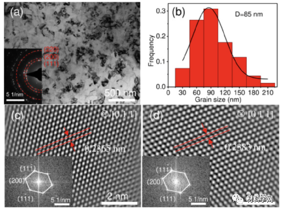 图5所示为Al-13Mg中间试样的微观结构:(a) TEM图像,嵌入的是SADF模式;(b)晶粒尺寸统计,平均值为85 nm;(c) (d)一个Al晶粒内两个不同区域的α-Al矩阵的HRTEM图像,嵌入的是相应的FFT图像。