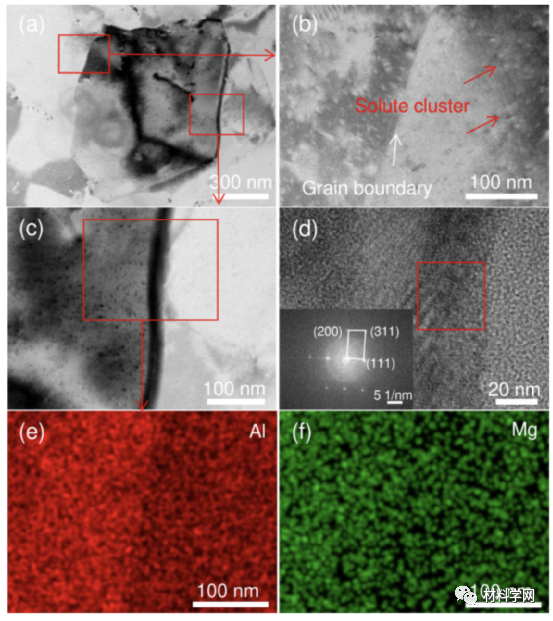图15所示为敏化的Al-13Mg合金:(a) (c) TEM图像;(b) STEM图像,晶界清晰;(d) (c)中对应晶界的HRTME图像;(e)(f) (c)中红框对应的EDS映射图像。