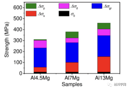 图 17所示为测量的屈服强度和不同强化机制对不同 Al-Mg 合金强度的相对贡献。Δσp:沉淀强化的贡献;Δσd:位错强化的贡献;Δσgr:晶界强化的贡献;Δσs:固溶强化的贡献;σ0:纯Al中的晶格摩擦应力。