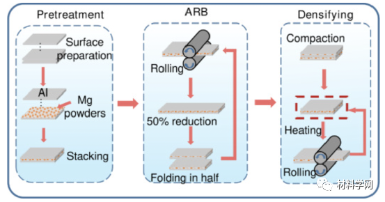 累积叠轧焊(ARB)工艺是一种通过大形变制备超细晶粒材料的工艺。 ARB 工艺也被应用于不同金属的多层复合材料的制备。在 ARB 过程中,随着轧制循环次数(N)的增加,金属逐渐破碎成颗粒并均匀分散在基体中。对于传统的 ARB 工艺(通常 N<10),破碎的金属颗粒通常很大,尺寸为数百微米。据报道,随着 N 的增加,破碎颗粒的尺寸会减小。另一方面,与 BM 类似,ARB 过程中的剧烈塑性变形可以增强原子的扩散程度。因此,具有超高N的ARB有望用于分散和细化金属颗粒,实现固态合金化。