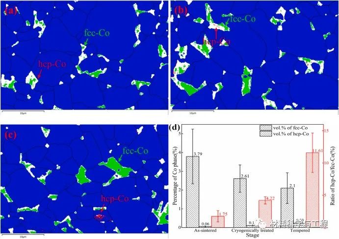 深冷+回火处理处理后hcp/fcc的平均比例从烧结阶段的1.75%增加到4.22%和11.61%。考虑到回火温度低于Co的相变点,因此回火处理过程中的马氏体相变因较大的残余应力演变而增强。残余应力作用于面心立方结构的Co相,补充马氏体相变所需的能量,而应力增强的无扩散相变是Co相fcc向hcp马氏体转变的主要机制。