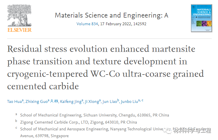 近日,川大研究人员研究了深冷+回火后微观结构变化对强度、硬度和韧性的影响,相关论文以题为“Residual stress evolution enhanced martensite phase transition and texture development in cryogenic-tempered WC-Co ultra-coarse grained cemented carbiden”发表在Materials Science and Engineering: A。