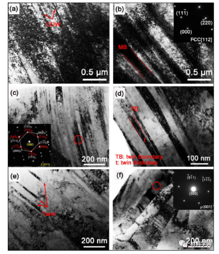 图 11. Mo0W9 HEA 在动态(~4100 s -1)变形后的 TEM 微观结构表征和相应的 SAED 图案。(a) 和 (b) BF 显微照片,显示致密的位错壁和微带;(ce) 明场显微照片显示变形孪晶和相应的 SAED 图案;(f) μ 相的明场显微照片和相应的 SAED 图案。