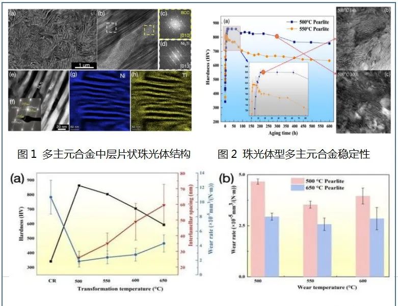 研究人员发现,与钢铁材料的相变相似,高熵合金中也可以发生共析反应而产生珠光体结构,共析转变发生于500°C至650°C,共析反应为FCC→BCC+Ni3Ti,片层结构由BCC相和Ni3Ti相片层交替排列而成。由于高熵合金中的迟滞扩散效应导致高熵珠光体的片层状结构比钢中珠光体更精细(如图1所示),因此珠光体高熵合金的硬度更高且在500°C和550°C时具备良好的热稳定性(如图2所示)。同时,与钢中的珠光体结构类似,多主元珠光体的片层间距也随共析转变温度的升高而增大,同时硬度随片层间距的增大而降低,变化趋势可见图3a。该珠光体高熵合金不仅在室温下具备优异的耐磨性能(磨损率~2×10-5mm3/Nm),在550℃与600℃的环境下耐磨性能依然良好(磨损率<3×10-5mm3/Nm),多主元珠光体在室温及高温下磨损率分别如图3a和b所示,低于相同温度下一系列高速钢或已开发的耐磨多主元合金。磨料磨损是该高熵合金在室温下的主要磨损机制,磨损速率与硬度呈典型的负相关关系,符合Archard定律。氧化和剥层磨损是该合金在高温下的主要磨损机制,这是因为在磨痕表面形成了致密的保护性氧化层,以及具有足够热强度和热稳定性的高加工硬化纳米再结晶层。因此,高熵合金中的珠光体结构是一种值得进一步研究和优化的具有极端环境应用前景的高性能结构,同时该研究为耐磨多主元合金的开发提供了新的思路。