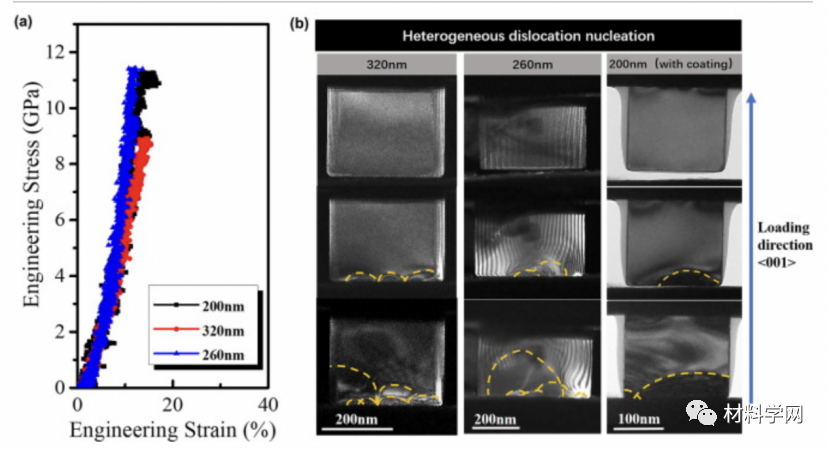 图3所示: TEM 内对大于 100 nm 的 MgO 纳米颗粒进行的原位压缩测试。(a) 直径为 320 nm、260 nm 和 200 nm 的 MgO 纳米颗粒的应力-应变曲线。(b) 从影像 1、2 和 3 中捕获的 TEM 图像,显示了在压缩测试期间三个 MgO 纳米颗粒表面的位错异质成核。