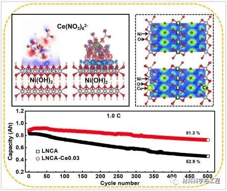 研究工作针对上述制约高镍正极材料大规模商业化应用问题,设计使用(NH4)2Ce(NO3)6对Ni0.8Co0.15Al0.05(OH)2前驱体进行预氧化掺杂来改性Li[Ni0.8Co0.15Al0.05]1-xCexO2高镍正极材料。论文采用密度泛函理论对预氧化掺杂剂进行筛选,计算显示Ce(NO3)62-可以促进前驱体中Ni2+氧化为Ni3+,有利于降低高镍正极材料阳离子混排。同时,适量Ce4+取代过渡金属离子可增强材料晶体结构的稳定性,抑制循环过程中过渡金属离子向锂层迁移。电化学性能结果也显示,Li[Ni0.8Co0.15Al0.05]0.97Ce0.03O2材料作为正电极,半电池1 C倍率循环100圈后容量保持率高达94.7%,实用型软包电池也显示出优异的能量密度(~300 Wh kg-1)和容量保持率(1 C倍率下循环500圈后的容量保持率为81.3%)。本工作为高镍正极材料制备改性和高性能锂离子电池的制备方面提供新的思路和见解。