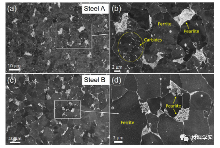 图 3。(a) 钢 A 和 (c) 钢 B 的初始 SEM 显微组织。RD 沿图的垂直方向。(b)(a)中白框标记区域的放大图,显示钢A中存在碳化物。(d)(c)中白框标记区域的放大图。