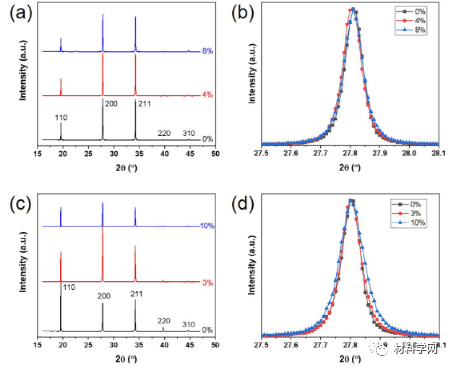 图 7。两种钢的同步加速器XRD结果。(a) 和 (c) 是 (a) 钢 A 和 (c) 钢 B 在不同应变下的同步加速器 XRD 曲线。拉伸方向沿 RD。(b) 和 (d) 显示了 (b) 钢 A 和 (d) 钢 B 在不同应变下的 (200) 峰。在 (b) 和 (d) 中,峰强度被归一化以识别峰展宽的存在。
