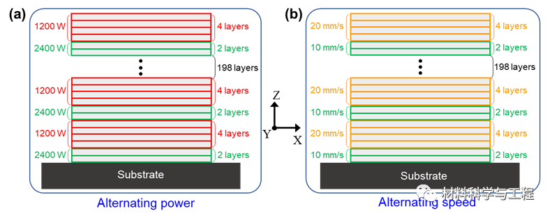 图1交替参数成形工艺(APP)样品沉积策略示意图。(a) 周期性交替使用1200 W和2400 W的激光功率;(b) 周期性交替使用10 mm/s和20 mm/s的扫描速度