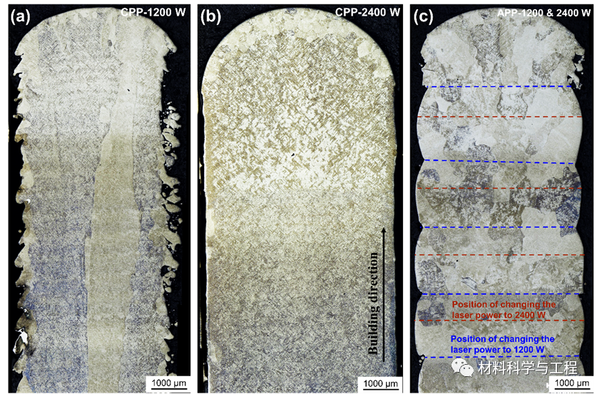 图2 传统成形工艺(CPP)与交替功率成形工艺(APP)获得的宏观晶粒形貌。(a) CPP-1200 W;(b) CPP-2400 W;(c)APP-1200 W&2400 W。