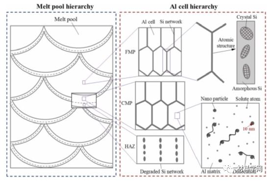图2:LPBF AlSi10Mg 微观结构的跨尺度方面,从埃大小的溶质原子、纳米颗粒和亚微米厚的胞状网络,到微米大小的晶粒和熔池。