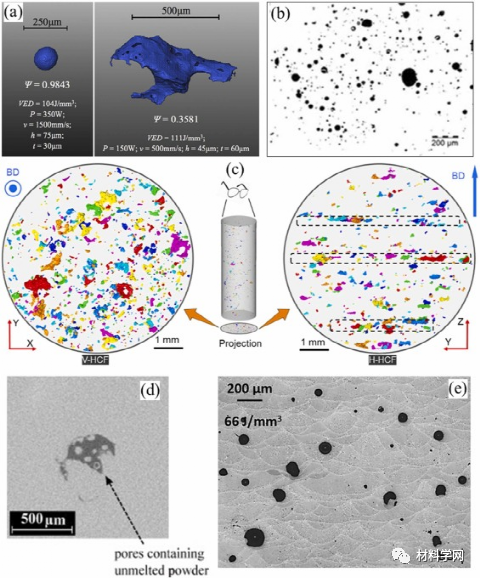 图8:LPBF AlSi10Mg 中存在的典型孔隙率。球形和不规则形状的孔(a)、氢气孔(b)、在不同投影平面上观察到的缺乏熔合孔(c)由于未熔化的粉末形成孔(d)锁孔孔隙率(e) 这些数字经 Elsevier 许可转载。