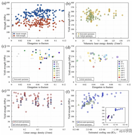图9:根据文献报道的数据统计了铸态 LPBF AlSi10Mg 的拉伸性能。强度与断裂伸长率 (a)、屈服强度与体积激光能量密度 (b)、水平试样 (c) 和垂直试样 (d) 在不同构建平台温度下的屈服强度与断裂伸长率、屈服强度与线性能量密度 (e),屈服强度与估计的冷却速率 (f)。水平试样涉及垂直于建筑物方向的加载方向,而垂直试样涉及平行于建筑物方向的加载方向。数据(f) 中的插图显示了三个单独的研究(从左到右),其中可以观察到冷却速率对水平试样屈服强度的影响。