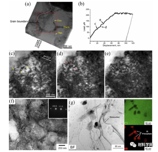 图10:LPBF AlSi10Mg变形过程中位错演变。原位TEM压缩试验在含有厚薄富硅共晶网络的双晶粒(a)、相应的负荷曲线(b)和位错演化过程中观察到的红色矩形区域(a)和不同的负荷水平(b) (c)-(e),在变形到3%(f)的拉伸试样中的位错模式,在变形拉伸试样中含有相对较大的Si颗粒(g)的位错-Si析出相相互作用。这些图片经 Elsevier 许可转载。