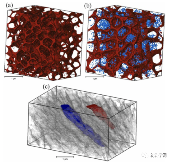 图3:制备的LPBF AlSi10Mg富Si共晶的FIB/SEM层析。构建平台温度为35°C (a)和200°C (b)的熔池核心区的3D绘制(3.5 × 3.4 × 2.5 μm),以及从35°C材料重建体(C)中出来的两个长管状胞状结构的可视化。图经Elsevier许可转载。