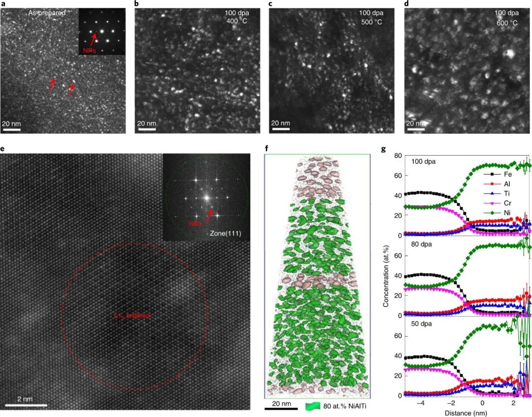 图6 当前策略在fcc Fe35.8Ni37.6Cr22.9Ti1.7Al2 (wt.%) MEA中的应用;a, TEM图像显示了所设计的fcc合金的NPs。插图为相应的SAED,显示了NPs的有序结构;b - d,沿{110}区拍摄的TEM图像显示了设计的fcc合金在400°C (b)、500°C (C)和600°C (d)的100 dpa辐照后的NPs。e,高分辨率的STEM图像,显示了设计的fcc合金在600℃下经过100 dpa辐照后的NP组织,其中一个典型的NP用红圈表示;f,重建三维APT数据集,并分析在600℃下经历不同剂量辐照损伤的NPs的成分。NPs的重点是包含超过80%的Ni、Al和Ti的区域;g,对应的接近直方图显示了通过卡其色指示的选定NPs的组成概况。
