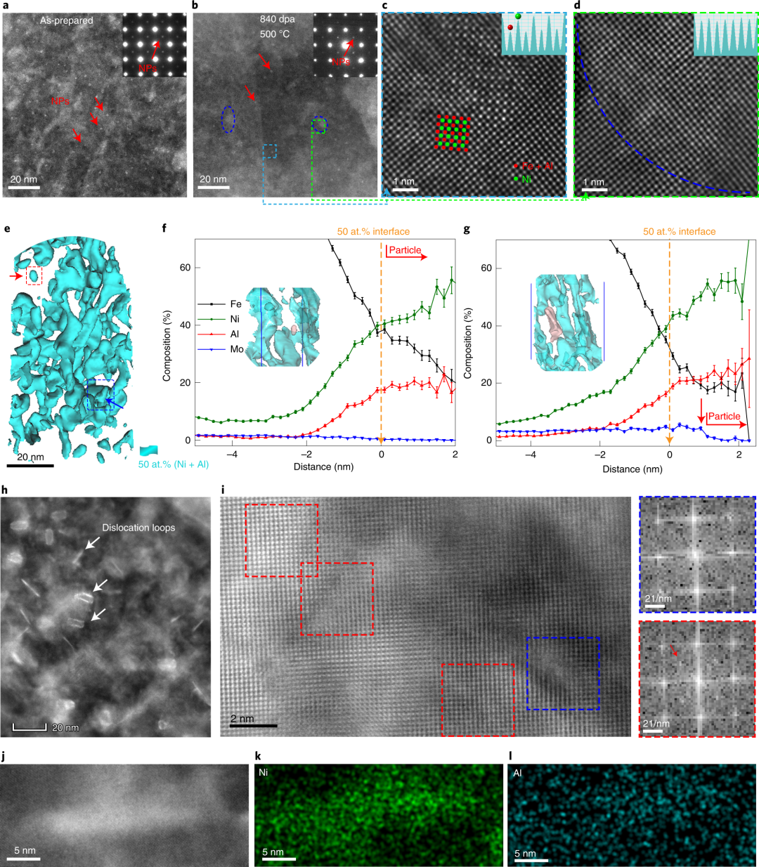 图2 离子辐照下超晶格钢的组织演变;a,b,超晶格钢在500℃0 dpa (a)和840 dpa (b)下的HAADF-STEM图像;c,d,高分辨率HAADF-STEM图像显示了NPs和富溶质区域之间的原子结构差异;e, APT表征的NPs在离子辐照过程中的演化,主要通过50at%Al和Ni等浓度表面显示和强调;f,g,距离直方图显示了所选沉淀(f)和溶质富集区域(g)的成分轮廓,其中误差条是均值的标准偏差;h, HAADF-STEM图像显示了500°C/840 dpa辐照后位错环的存在;i,高分辨率HAADF-STEM图像,显示位错环附近存在NPs,以及相应的FFT结果(右蓝红框);j, HAADF图像显示一个“愈合”的a/2<100>位错环远离析出物;k,l,对应Ni (k)和Al (l)的EDS面扫。