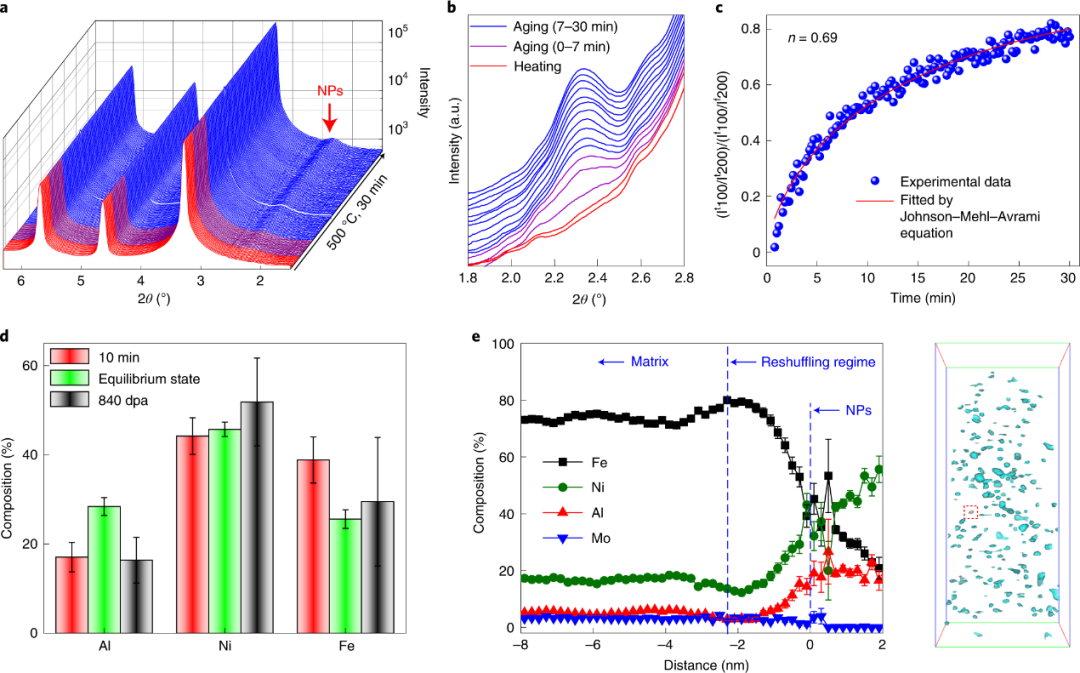 图4 时效过程中NPs的快速形成动力学;a,同步XRD结果显示,在500°C时效过程中,随着时间的推移形成了NPs。b, x射线衍射谱放大图显示在500°C时效过程中B2的峰变宽;c,对应的峰强比表明NPs的析出速度非常快。其中It 100、If 100、It 200和If 200分别表示t时刻(100)和末态(200)的峰值强度。d、对该钢在500℃时效3 h(即超晶格钢的平衡态处理)、500℃时效10 min和500℃840 dpa辐照三种不同条件下的APT分析得到的B2相组成。e,在500℃下时效10分钟的钢溶质的APT表征,显示以卡其色标记的选定NPs的成分分布图的邻近直方图(右)。误差条是均值的标准偏差。