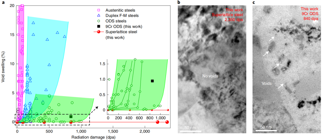 图1 含高密度Ni(Al,Fe) NPs的超晶格钢具有优良的辐照耐受性。b和c的比较表明,超晶格钢的抗空隙膨胀性能比9Cr ODS钢强得多;a. 与传统奥氏体钢、铁素体马氏体钢和ODS钢相比,超晶格钢中的空隙膨胀现象更为明显,插图(虚线矩形框的放大视图)显示,与几种典型的ODS钢相比,超晶格钢呈现零空洞膨胀;b. 500℃时,超晶格钢在2350 dpa后条件下辐照损伤后的TEM显微图,未见空洞产生;c. 500℃时,9Cr ODS钢在840 dpa后条件下辐照损伤后的TEM显微图,观察到大量空洞。