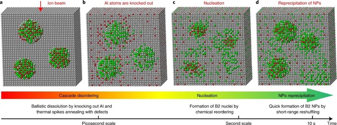 图5 超晶格钢中NPs的无序和重新有序过程随时间的函数示意图。 a-d、Fe、Ni和Al原子分别用灰色、绿色和红色的球标记