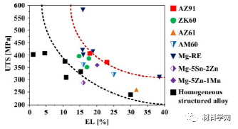 图 4。多峰/双峰晶粒高合金镁合金与均质结构高合金镁合金的机械性能比较。两条虚线显示强度和延展性之间的权衡关系(香蕉曲线)。