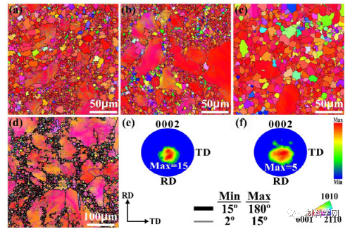 图 7。(a-c) HPR 处理的 AZ91 合金在 (a) 300 °C, (b) 350 °C, (c) 400 °C 下的 EBSD-OIM 图。(d-f) HPR 在 350 °C 下处理的 ATZ821 合金的EBSD图:(d) EBSD OIM 图和 (e) 所有晶粒和 (f) 细晶粒的相应织构。