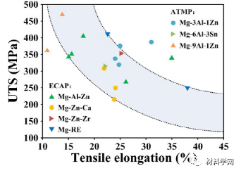 图 8。UTS与 ECAPed 和 ATMPed 合金的伸长率之间的关系,包括 Mg-Al-Zn、Mg-Al-Sn、Mg-Zn-Ca、Mg-Zn-Zr和 Mg-RE 系统合金。两条虚线显示强度和延展性之间的权衡关系(香蕉曲线)。