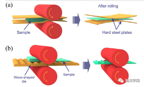 图 6。示意图显示了 (a) 硬板轧制 (HPR)和 (b) 波形模轧 (WDR)的过程。