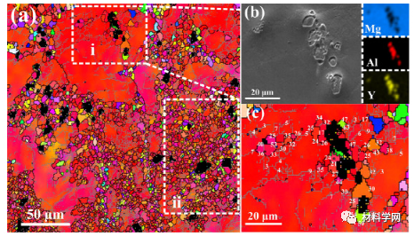 图 3。(a) EBSD取向图显示了 HPRed AZ91-1Y 样品中由粗 Al 2 Y 颗粒(区域 i)和完全再结晶(区域 ii)诱导的 PSN 的证据;(b) 区域 i 的放大 SEM 图和 EDS 映射分析;(c) 在区域 i [11]中,围绕 Al 2 Y 粒子的选定 GB 的取向错误(以度为单位)。