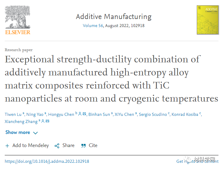 TiC纳米颗粒均匀分布在AM制备的HEC样品中,主要沿着细胞亚结构分布。纳米颗粒的加入不仅防止了Mn损失,从而具有更好的致密化,而且与纯HEA样品相比,在HEC样品中产生更好的增强效果。这种效应有助于强度的显着增加(41%),并且在293 K时仅略微降低延展性(10.8%)。