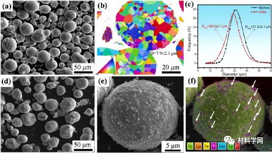 图 1.粉末特性:(a)和(b)初始HEA粉末的典型形貌和晶粒尺寸,(c)球磨前后HEA粉末的粒度分布,(d)和(e)HEC粉末共混物的典型形貌,(f)HEC的元素分布,表明TiC纳米颗粒(用f中的白色箭头标记)在HEA粉末表面的均匀分布。