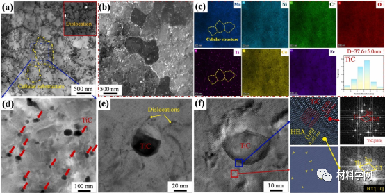 图 5.沿TD-ND平面对HEC样品进行TEM分析:(a)细胞亚结构的BF图像,(b)细胞亚结构的HAADF图,(c)对应于(b)TiC纳米颗粒和尺寸分布的EDS图,(d)来自(a)标记区域的放大暗场(DF)图像,表明许多TiC和位错分布在细胞亚结构的内部, (e)和(f)HEA基质与TiC纳米颗粒之间界面特征的BF图像,逆快速傅里叶变换(IFFT)图像表明HEA基质和TiC纳米颗粒之间存在半相干界面形式以及界面周围的高密度位错。