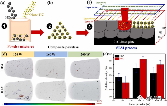 图 2.。(a-c)复合粉末和LPBF加工的制备过程的图形表示,包括粉末混合,复合材料粉末和扫描策略,分别,(d)激光功率对HEA和HEC样品中缺陷分布的影响,(e)激光功率与HEA和HEC样品相对密度之间的关系。