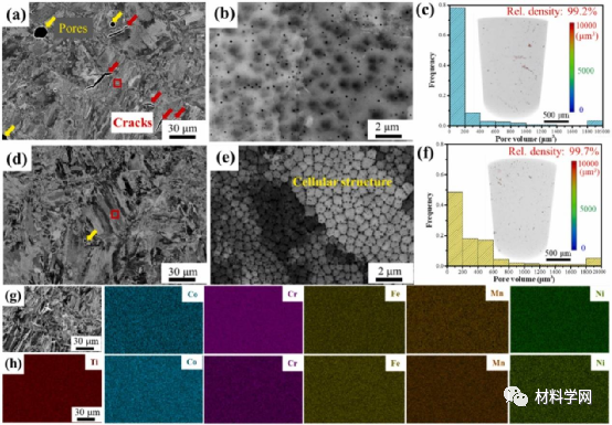 图 3.沿横向-法线方向(TD-ND)平面的背散射衍射(BSD)图像:(a-b)HEA;(d-e)HEC,其中孔隙和裂纹分别用黄色和红色箭头标记,分别对HEA和HEC样品进行(c)和(f)缺陷分析,分别对HEA样品和HEC样品进行(g)和(h)EDS分析。